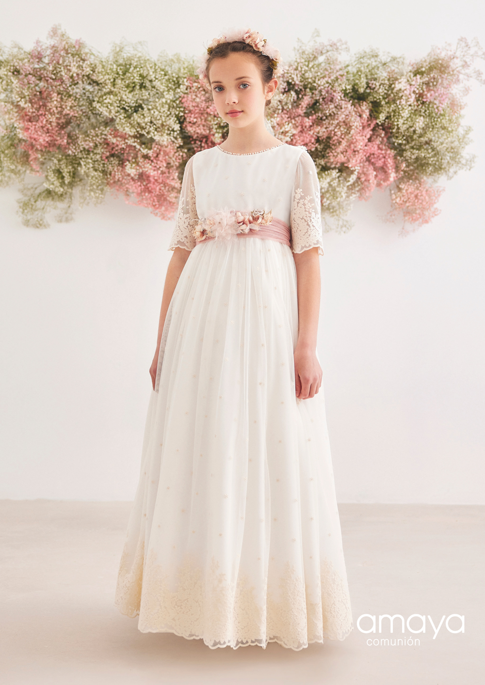 Es de la firma de vestidos de comunión que más trabajamos con prácticamente la colección al completo, en ella puedes encontrar una colección de vestidos de comunión para niña muy románticos donde este año destaca el color y donde predominan los tules bordados.